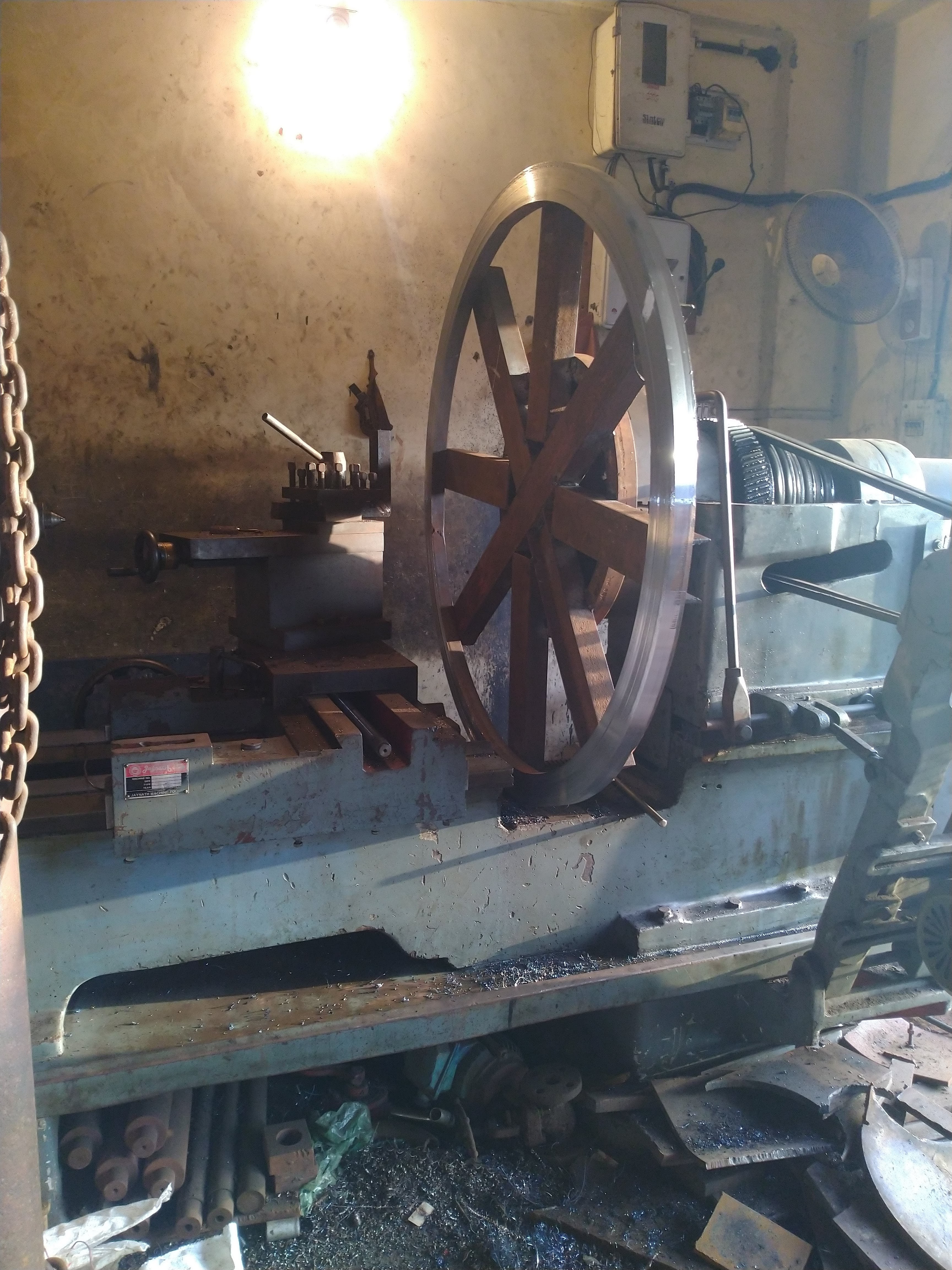 Sure, I'd be happy to explain the process of manufacturing a flat belt pulley from aluminum based on a sample at Anand Engineering & Marine Works company. Material Selection: The first step involves choosing the appropriate grade of aluminum based on the specific requirements of the pulley, such as its size, load-bearing capacity, and intended use. Pattern Making: A pattern is created based on the sample pulley. This pattern serves as a template for creating the mold that will be used to shape the aluminum into the desired pulley form. Mold Preparation: The pattern is used to create a mold cavity. This mold can be made of sand or other materials suitable for casting. The mold is created in two halves to allow for easy removal of the finished pulley. Melting and Pouring: Aluminum is melted in a furnace to its liquid state. Once the desired temperature is reached, the molten aluminum is poured into the prepared mold cavity. Cooling and Solidification: The molten aluminum cools a...